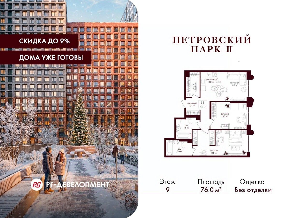 Продаётся 2-комнатная квартира 76,0 кв.м. в ЖК "Петровский парк II" на 9-м этаже 19 этажного дома.