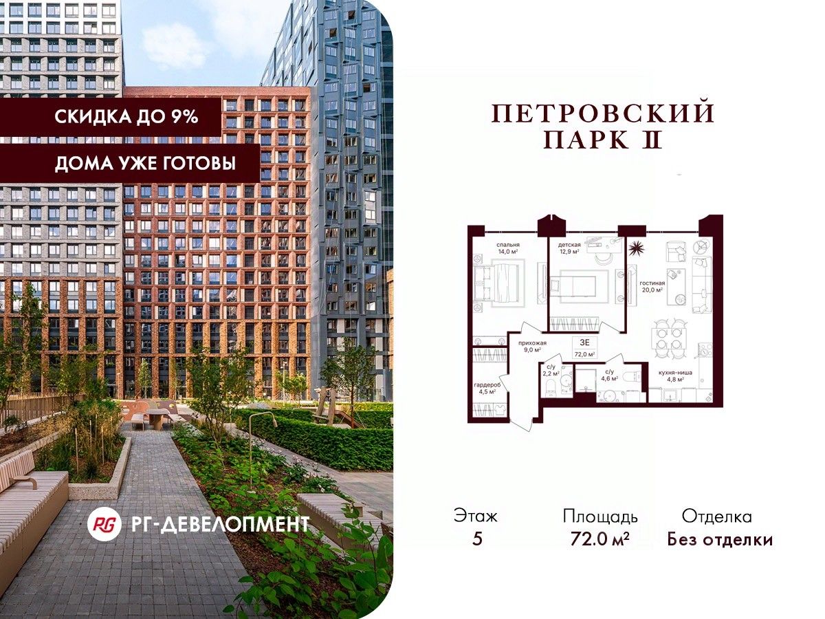 Продаётся 2-комнатная квартира 72,0 кв.м. в ЖК "Петровский парк II" на 5-м этаже 25 этажного дома.