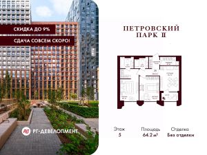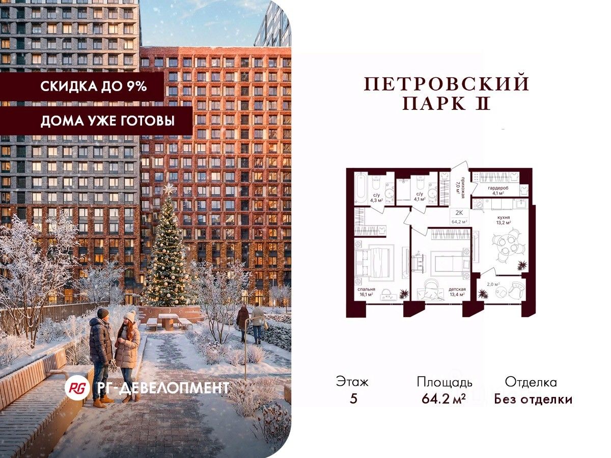 Продаётся 2-комнатная квартира 64,2 кв.м. в ЖК "Петровский парк II" на 5-м этаже 21 этажного дома.