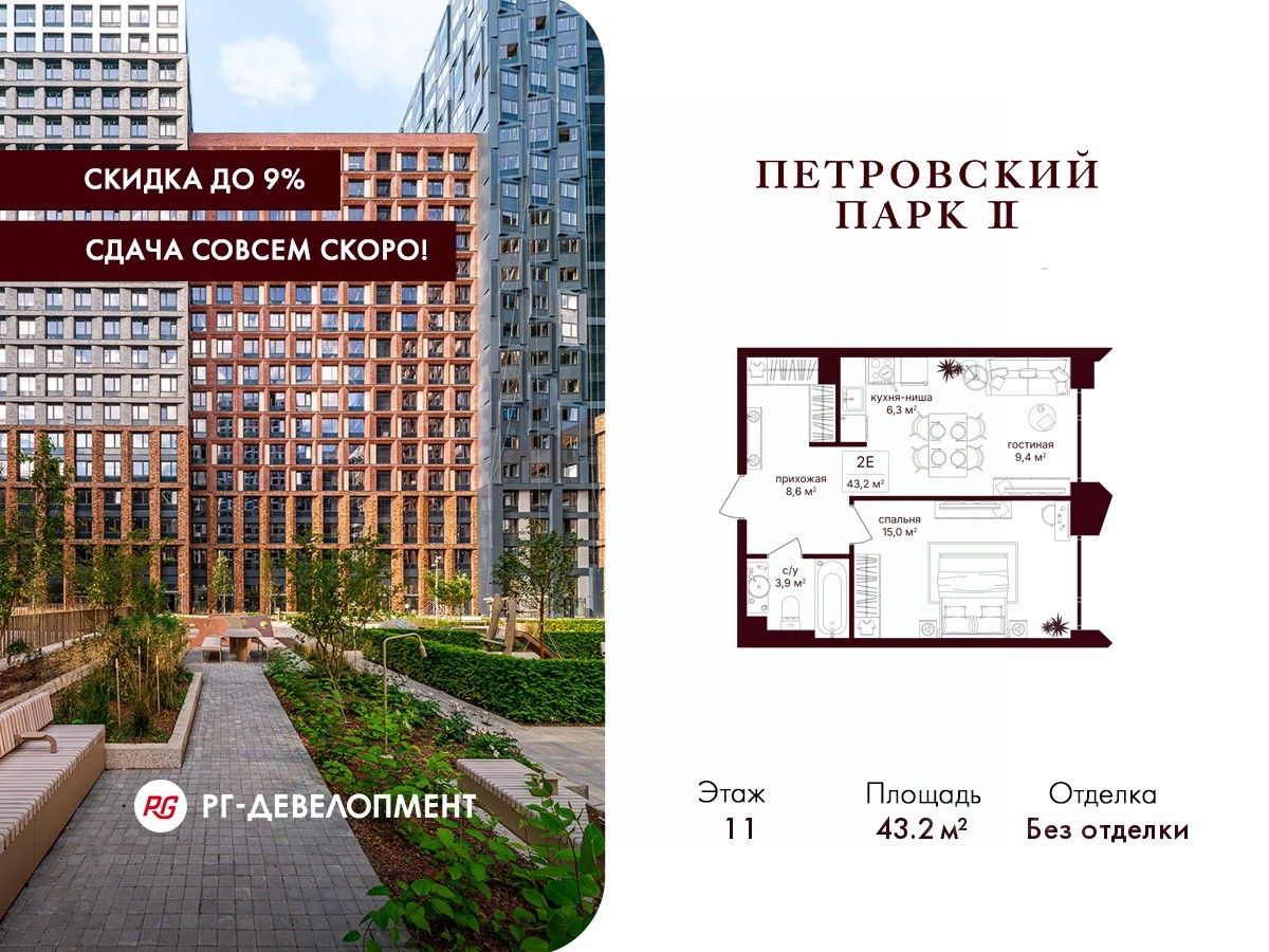 Продаётся 1-комнатная квартира 43,2 кв.м. в ЖК "Петровский парк II" на 11-м этаже 19 этажного дома.
