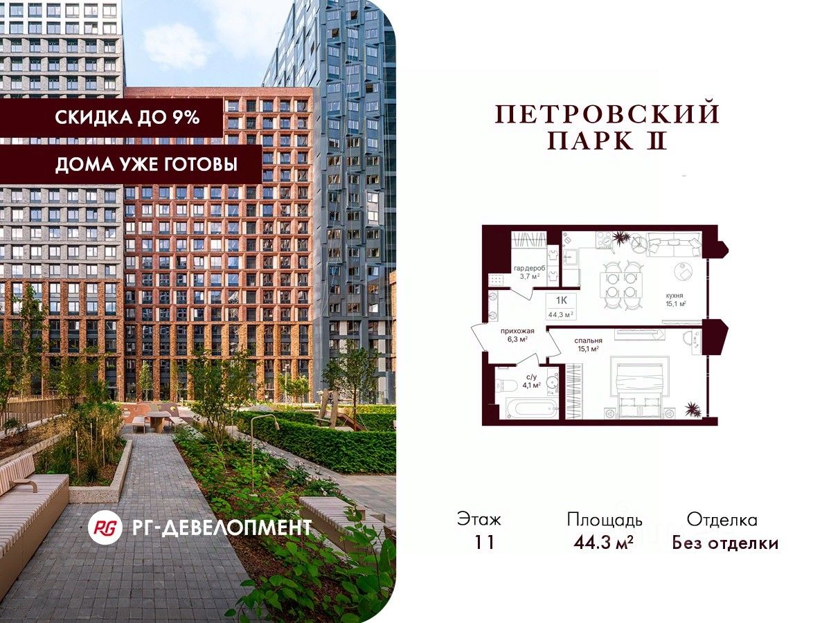 Продаётся 1-комнатная квартира 44,3 кв.м. в ЖК "Петровский парк II" на 11-м этаже 19 этажного дома.