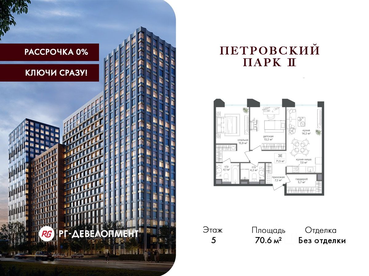 Продаётся 2-комнатная квартира 70.6 кв.м. в ЖК "Петровский парк II" на 5-м этаже 21 этажного дома.