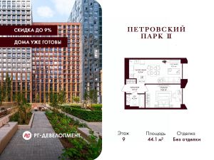 Продаётся 1-комнатная квартира 44,1 кв.м. в ЖК "Петровский парк II" на 9-м этаже 15 этажного дома.