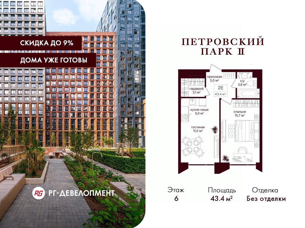 Продаётся 1-комнатная квартира 43,4 кв.м. в ЖК "Петровский парк II" на 6-м этаже 21 этажного дома.