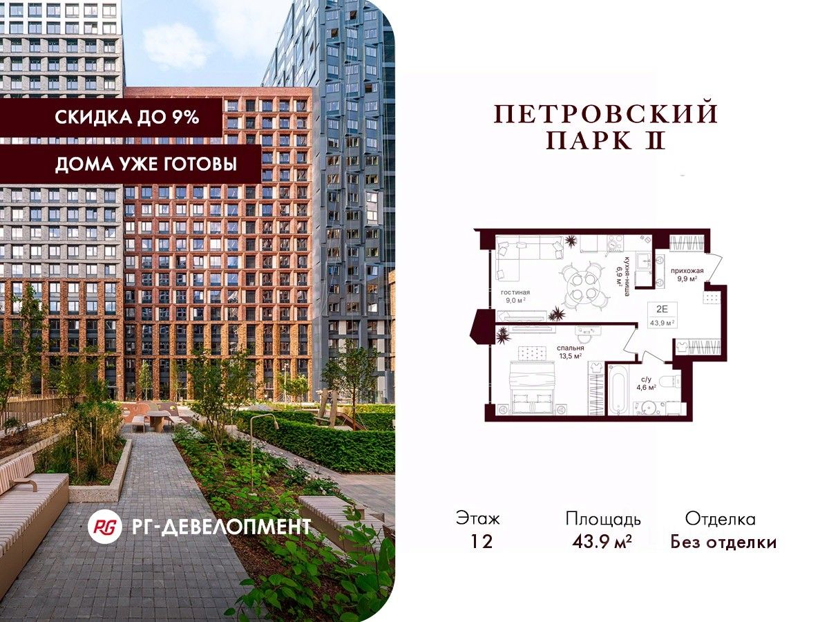 Продаётся 1-комнатная квартира 43,9 кв.м. в ЖК "Петровский парк II" на 12-м этаже 19 этажного дома.