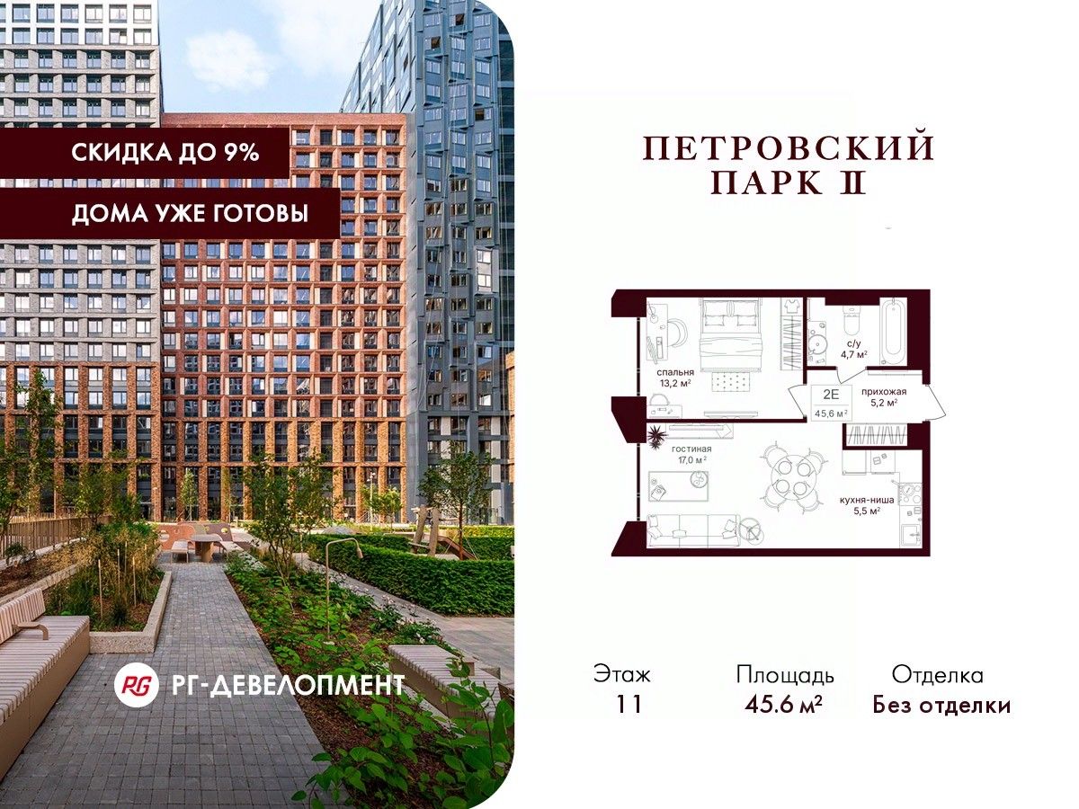 Продаётся 1-комнатная квартира 45,6 кв.м. в ЖК "Петровский парк II" на 11-м этаже 15 этажного дома.