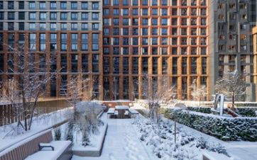 Внутренний двор комплекса - это отдельный мир, закрытый от машин и городского шума. Ландшафтный дизайн отсылает к регулярным дворцовым садам: геометрия аллей, зелёные "кабинеты", цветники и камерные зоны отдыха создают разные сценарии для повседневной жизни. Здесь органично соседствуют детские игровые пространства, плейхаб, спортивные зоны и тихие места для отдыха.