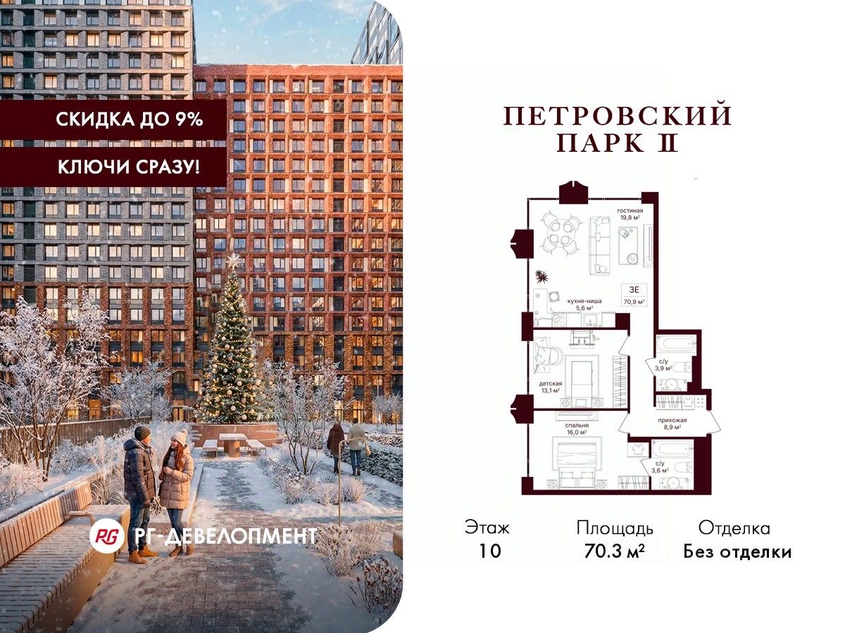 Продаётся 2-комнатная квартира 70.3 кв.м. в ЖК "Петровский парк II" на 10-м этаже 25 этажного дома.