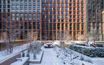 Внутренний двор комплекса - это отдельный мир, закрытый от машин и городского шума. Ландшафтный дизайн отсылает к регулярным дворцовым садам: геометрия аллей, зелёные "кабинеты", цветники и камерные зоны отдыха создают разные сценарии для повседневной жизни. Здесь органично соседствуют детские игровые пространства, плейхаб, спортивные зоны и тихие места для отдыха.