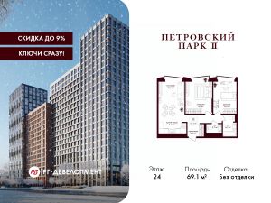Продаётся 2-комнатная квартира 69.1 кв.м. в ЖК "Петровский парк II" на 24-м этаже 25 этажного дома.