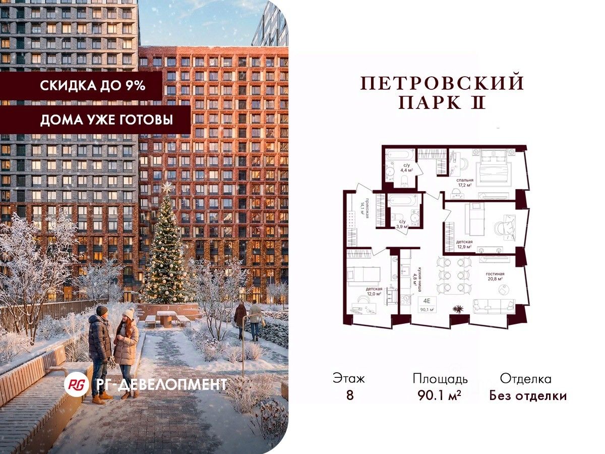 Продаётся 3-комнатная квартира 90,1 кв.м. в ЖК "Петровский парк II" на 8-м этаже 25 этажного дома.