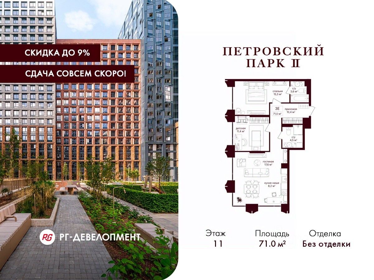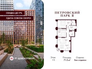 Продаётся 2-комнатная квартира 71,0 кв.м. в ЖК "Петровский парк II" на 11-м этаже 25 этажного дома.