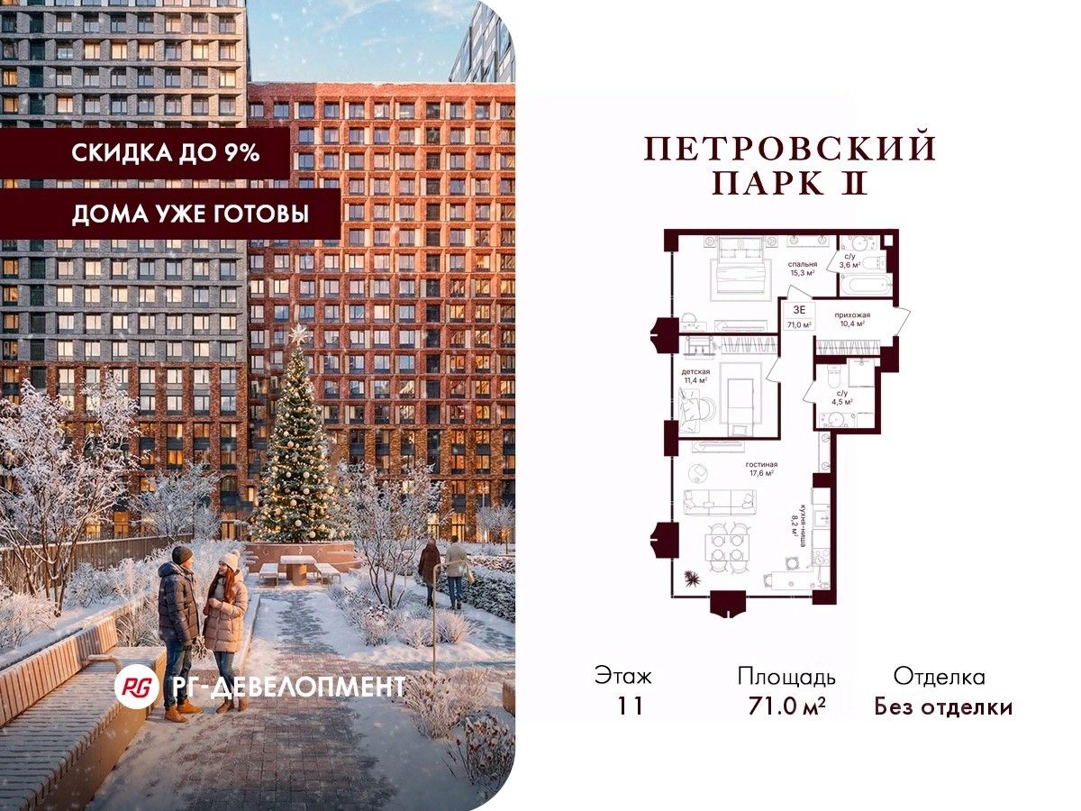 Продаётся 2-комнатная квартира 71.0 кв.м. в ЖК "Петровский парк II" на 11-м этаже 25 этажного дома.