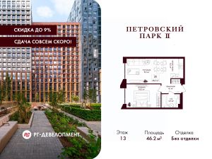 Продаётся 1-комнатная квартира 46,2 кв.м. в ЖК "Петровский парк II" на 13-м этаже 15 этажного дома.
