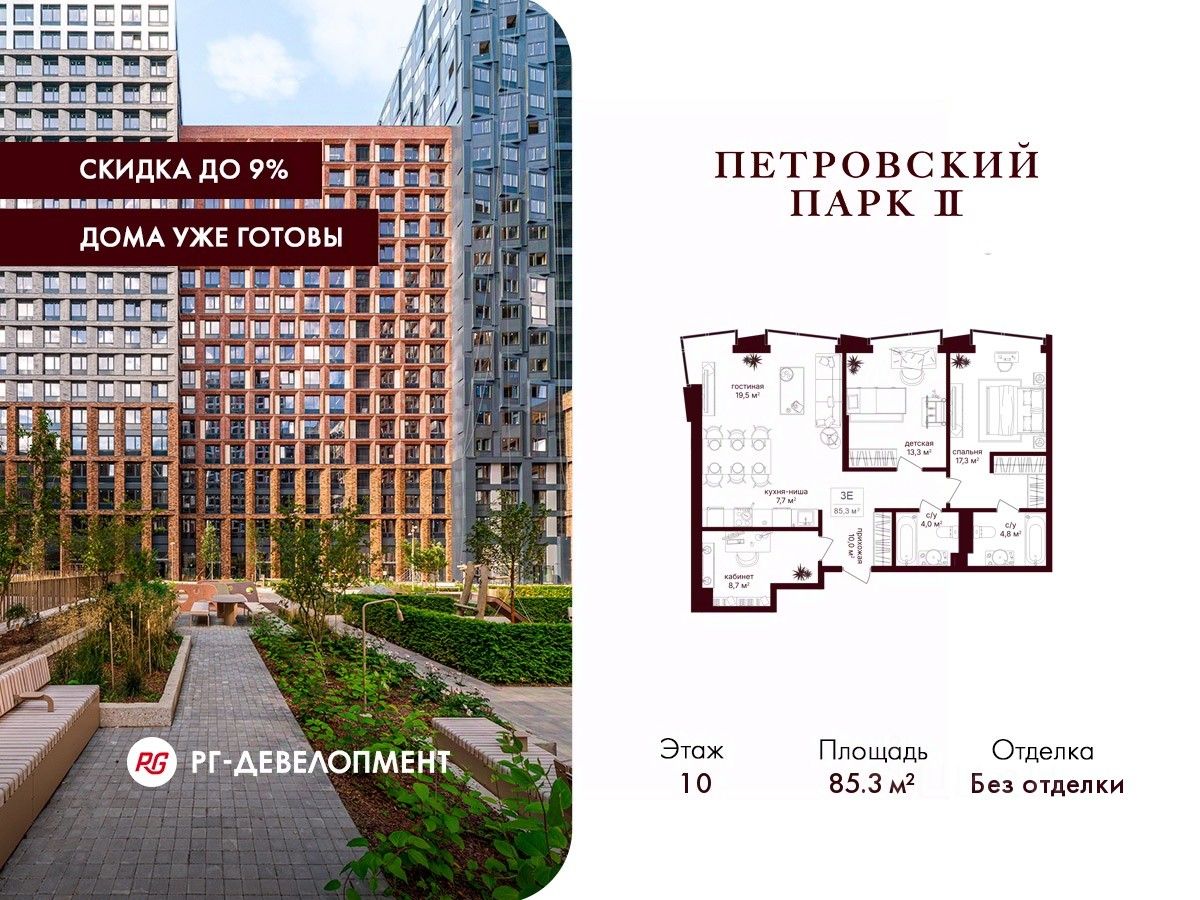 Продаётся 2-комнатная квартира 85,3 кв.м. в ЖК "Петровский парк II" на 10-м этаже 25 этажного дома.