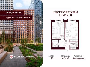 Продаётся 1-комнатная квартира 47,6 кв.м. в ЖК "Петровский парк II" на 10-м этаже 25 этажного дома.