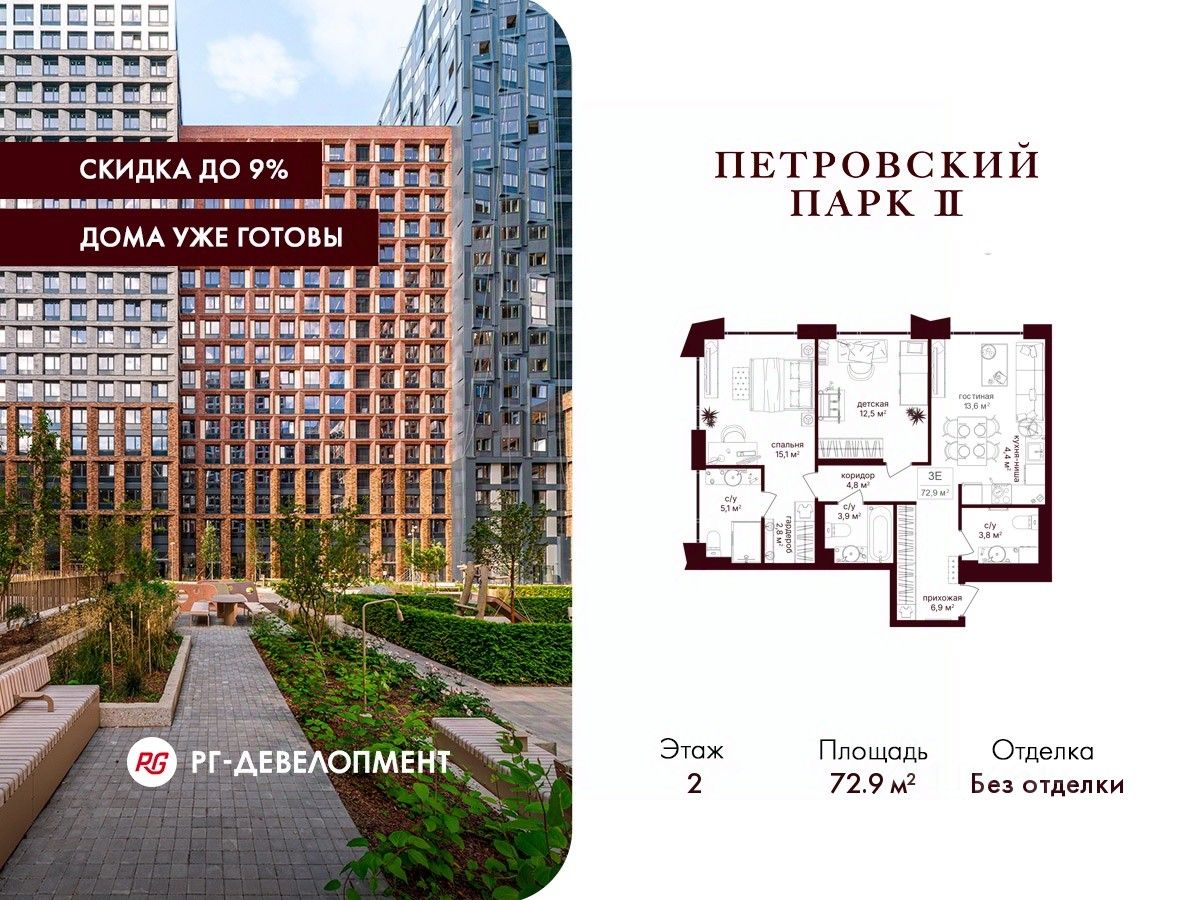 Продаётся 2-комнатная квартира 72,9 кв.м. в ЖК "Петровский парк II" на 2-м этаже 24 этажного дома.