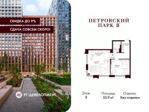 Продаётся 1-комнатная квартира 52,9 кв.м. в ЖК "Петровский парк II" на 9-м этаже 24 этажного дома.