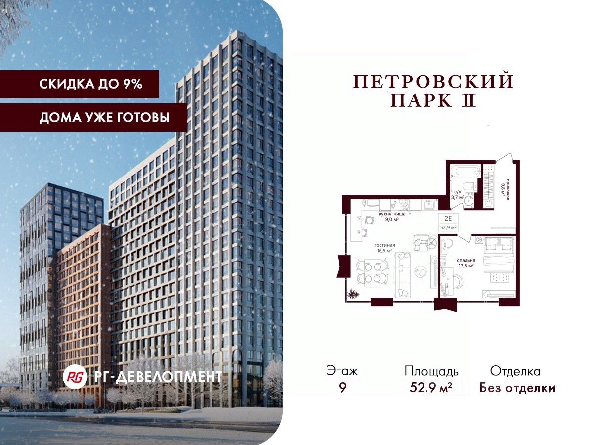 Продаётся 1-комнатная квартира 52.9 кв.м. в ЖК "Петровский парк II" на 9-м этаже 24 этажного дома.