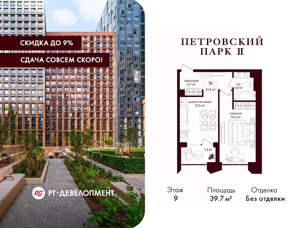 Продаётся 1-комнатная квартира 39,7 кв.м. в ЖК "Петровский парк II" на 9-м этаже 17 этажного дома.