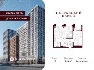 Продаётся 2-комнатная квартира 64.2 кв.м. в ЖК "Петровский парк II" на 11-м этаже 21 этажного дома.
