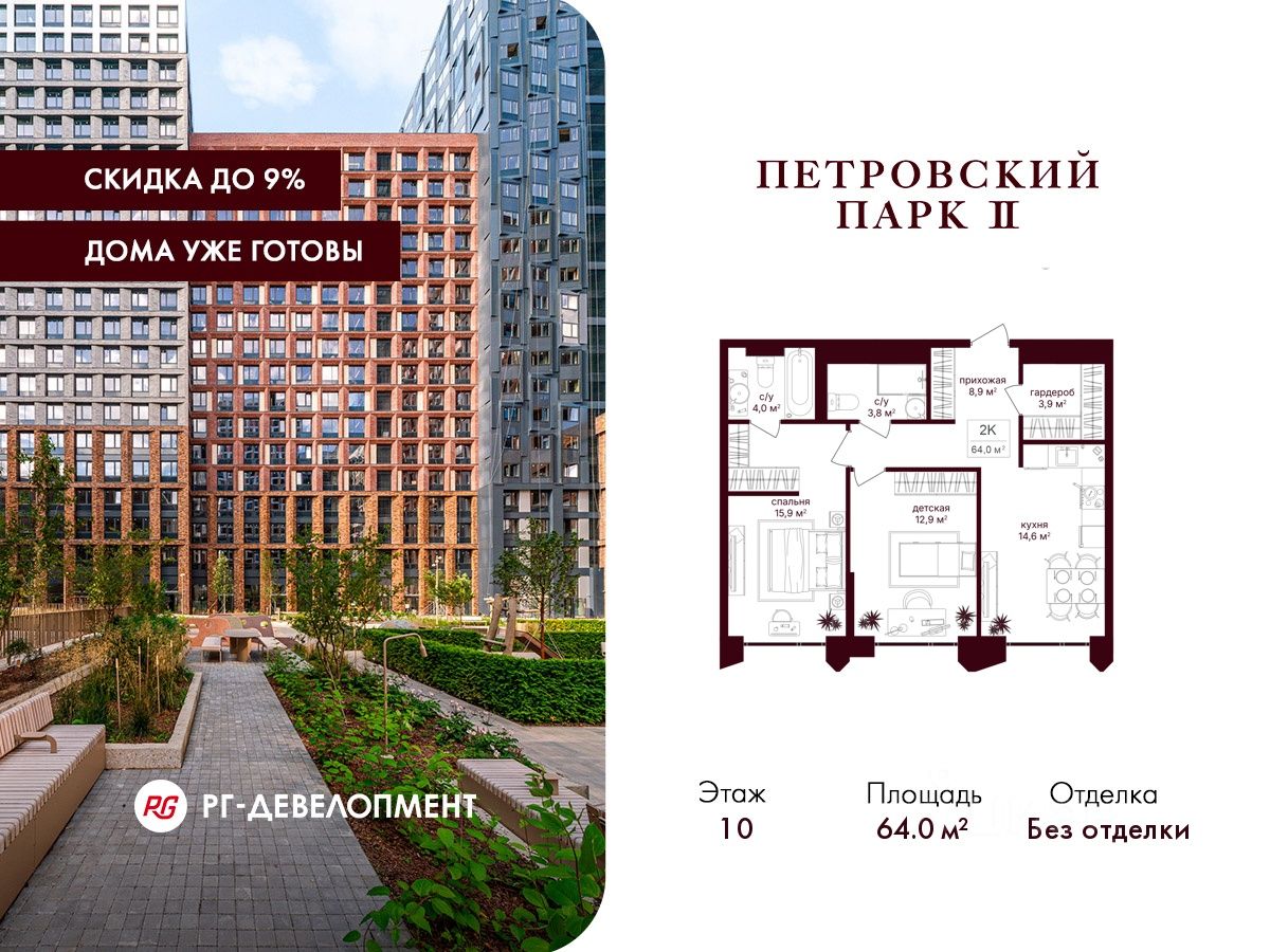 Продаётся 2-комнатная квартира 64,0 кв.м. в ЖК "Петровский парк II" на 10-м этаже 17 этажного дома.