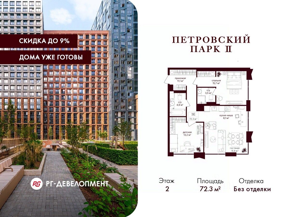 Продаётся 2-комнатная квартира 72,3 кв.м. в ЖК "Петровский парк II" на 2-м этаже 24 этажного дома.