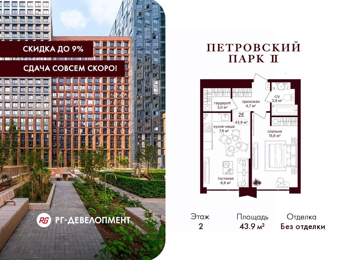Продаётся 1-комнатная квартира 43,9 кв.м. в ЖК "Петровский парк II" на 2-м этаже 24 этажного дома.