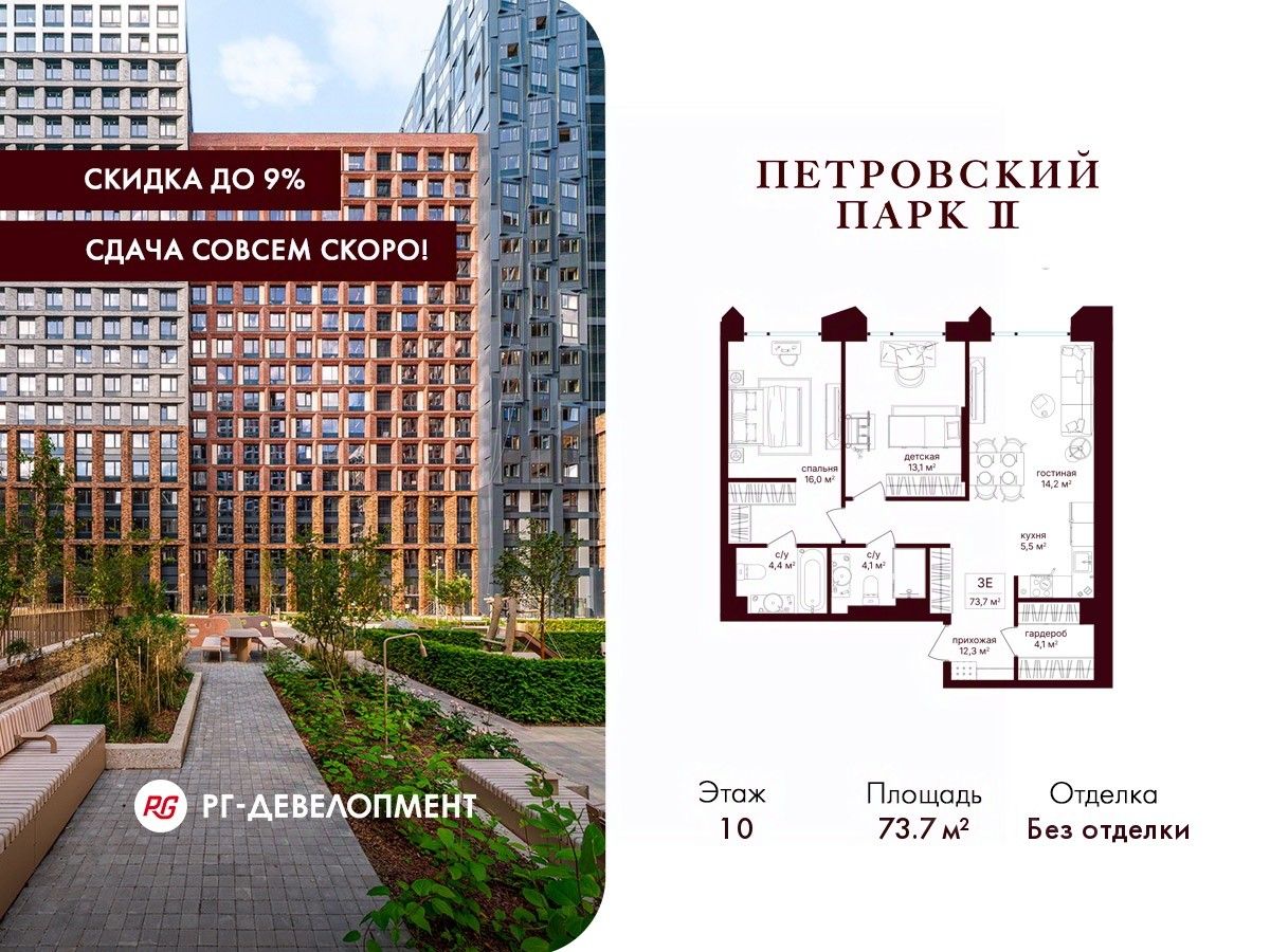 Продаётся 2-комнатная квартира 73,7 кв.м. в ЖК "Петровский парк II" на 10-м этаже 17 этажного дома.