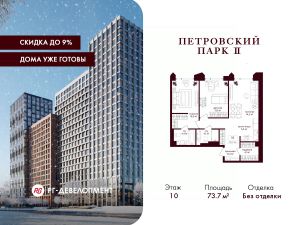 Продаётся 2-комнатная квартира 73.7 кв.м. в ЖК "Петровский парк II" на 10-м этаже 17 этажного дома.