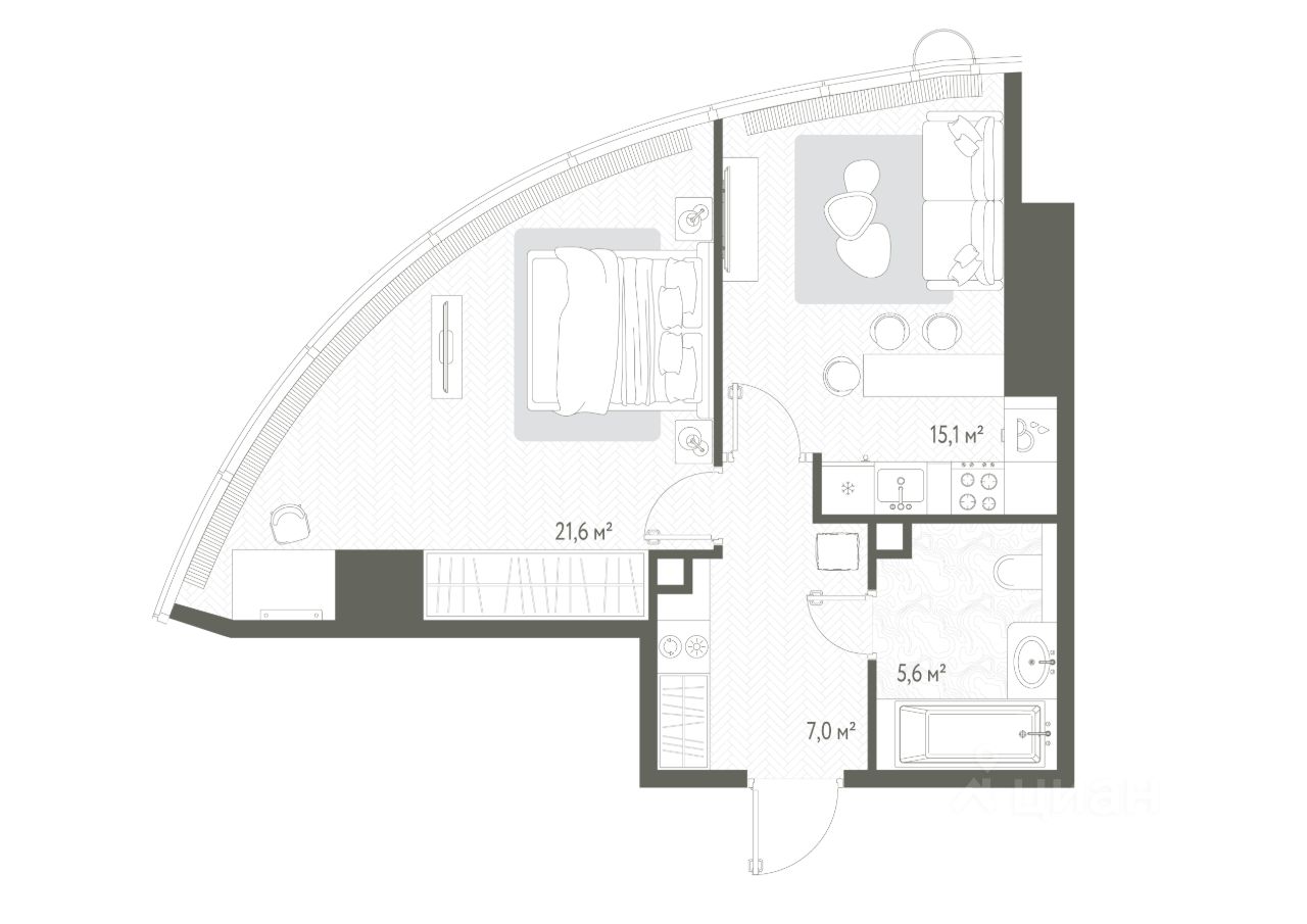 В продаже 1-комнатная квартира площадью 49.30 м² на 39-м этаже.