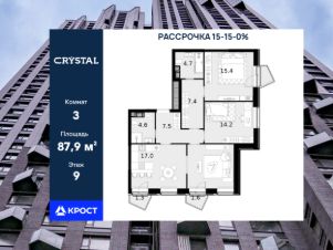 Однокомнатная квартира площадью 87,9 кв.м. на 9 этаже дома бизнес-класса "CRYSTAL Трилогия".