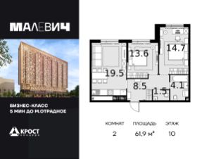 Продаётся 2-к квартира 61.9 кв.м. на 10-м этаже 28 этажного дома.
