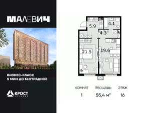 Продаётся 1-к квартира 55.4 кв.м. на 16-м этаже 28 этажного дома.