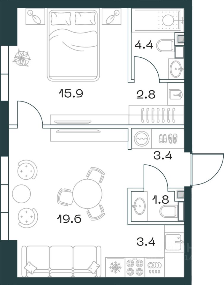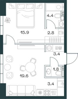 1-к квартира в премиальном комплексе SHIFT на 2-м этаже в 18 этажном здании. Общая площадь 51.8 кв. м.