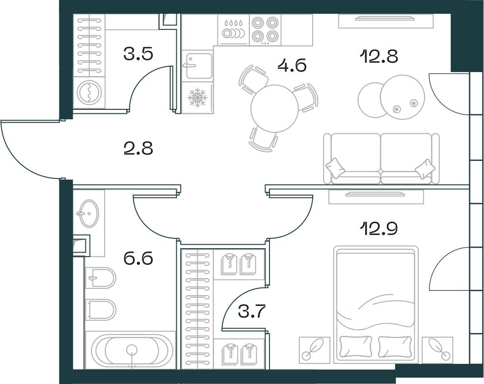 1-к квартира в премиальном комплексе SHIFT на 2-м этаже в 18 этажном здании. Общая площадь 48.7 кв. м.