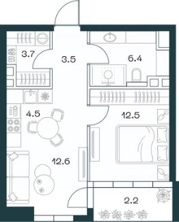 2-к квартира в премиальном комплексе SHIFT на 2-м этаже в 18 этажном здании. Общая площадь 45.4 кв. м.