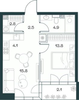 2-к квартира в премиальном комплексе SHIFT на 2-м этаже в 18 этажном здании. Общая площадь 46 кв. м.