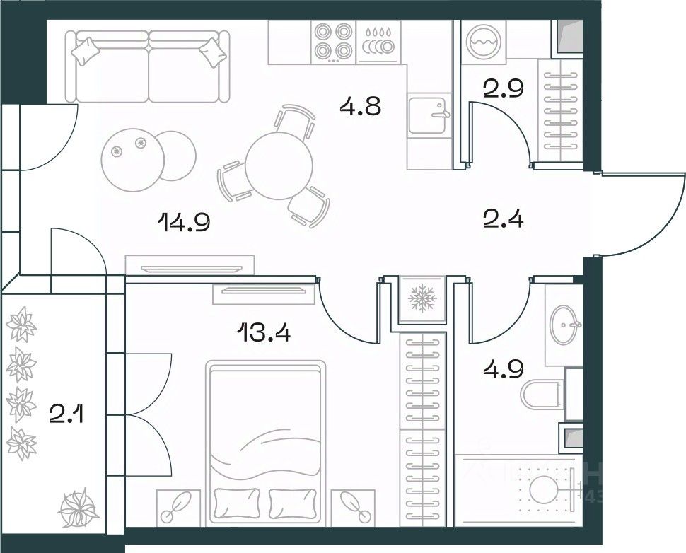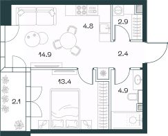 2-к квартира в премиальном комплексе SHIFT на 2-м этаже в 18 этажном здании. Общая площадь 45.3 кв. м.