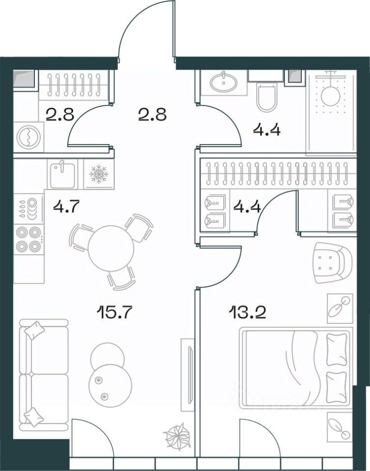 1-к квартира в премиальном комплексе SHIFT на 4-м этаже в 18 этажном здании. Общая площадь 48 кв. м.