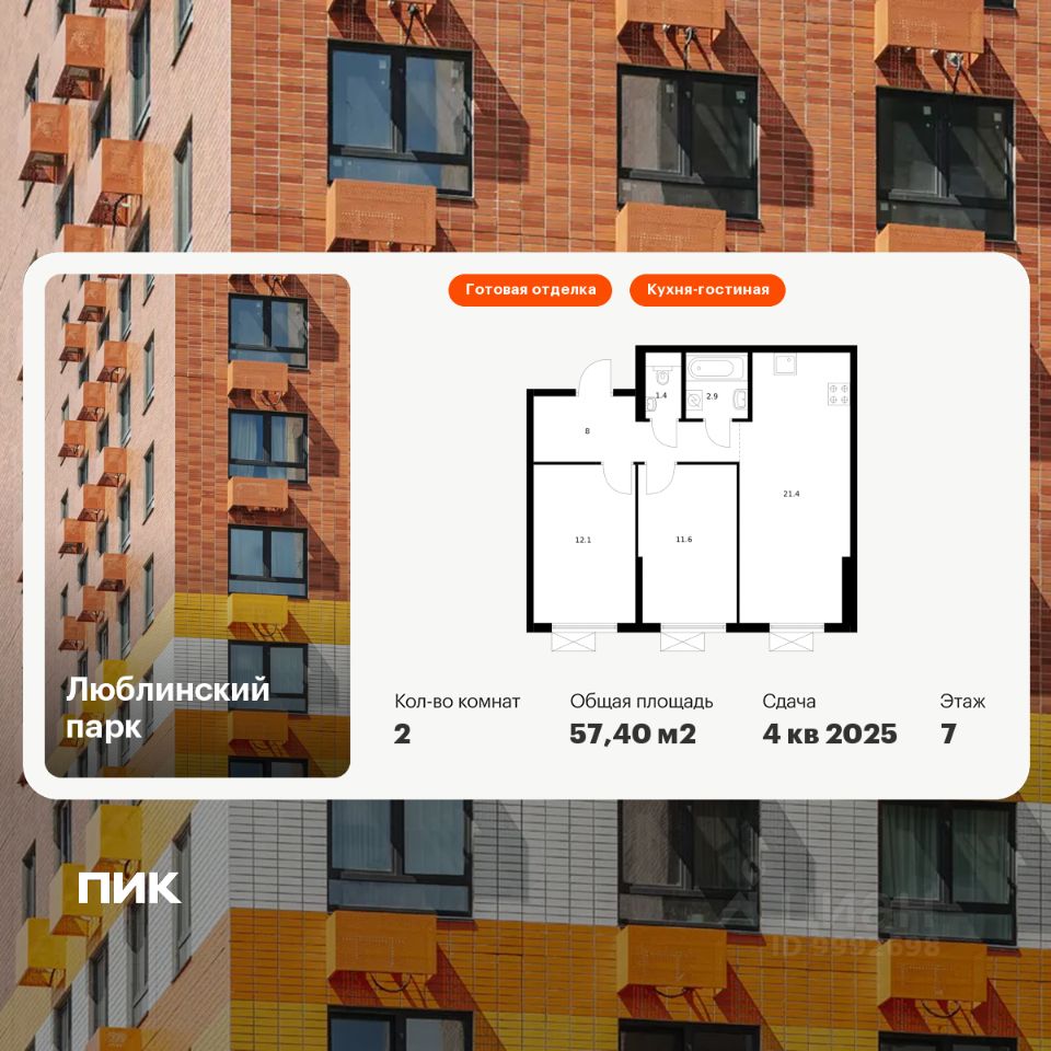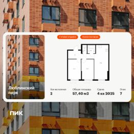Продаётся 2-комн. квартира площадью 57,4 кв.м на 7 этаже 16 этажного дома (Корпус 12, Секция 6) проекта ПИК Люблинский парк. Светлый просторный подъезд на уровне земли, функциональная планировка, большие окна, c отделкой.