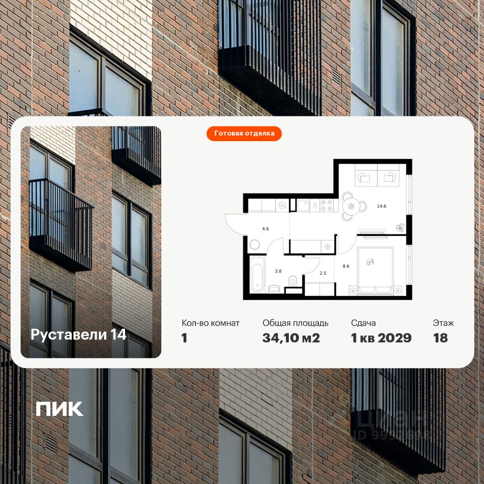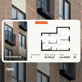 Продаётся 1-комн. квартира площадью 34,1 кв.м на 18 этаже 21 этажного дома (Корпус 3.5, Секция 1) проекта ПИК Руставели 14. Светлый просторный подъезд на уровне земли, функциональная планировка, большие окна, c отделкой.