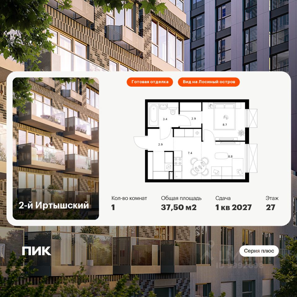 Продаётся 1-комн. квартира площадью 37,5 кв.м на 27 этаже 30 этажного дома (Корпус 1.3, Секция 3) проекта ПИК 2-й Иртышский. Светлый просторный подъезд на уровне земли, функциональная планировка, большие окна, c отделкой.