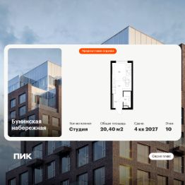 Продаётся квартира-студия площадью 20,4 кв.м на 10 этаже 16 этажного дома (Корпус 2.6/1.2, Секция 2) проекта ПИК Бунинская набережная. Светлый просторный подъезд на уровне земли, функциональная планировка, большие окна, предчистовая отделка.