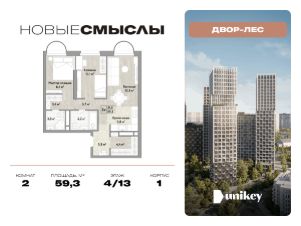 В жилом комплексе, расположенном по соседству с ландшафтным парком "Южное Бутово", продается 2-комнатная квартира площадью 59.30 кв. м. с отделкой. Квартира расположена на 4 этаже 1 корпуса в жилом квартале комфорт-класса "Новые Смыслы" (ГК Unikey/Юникей).