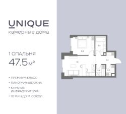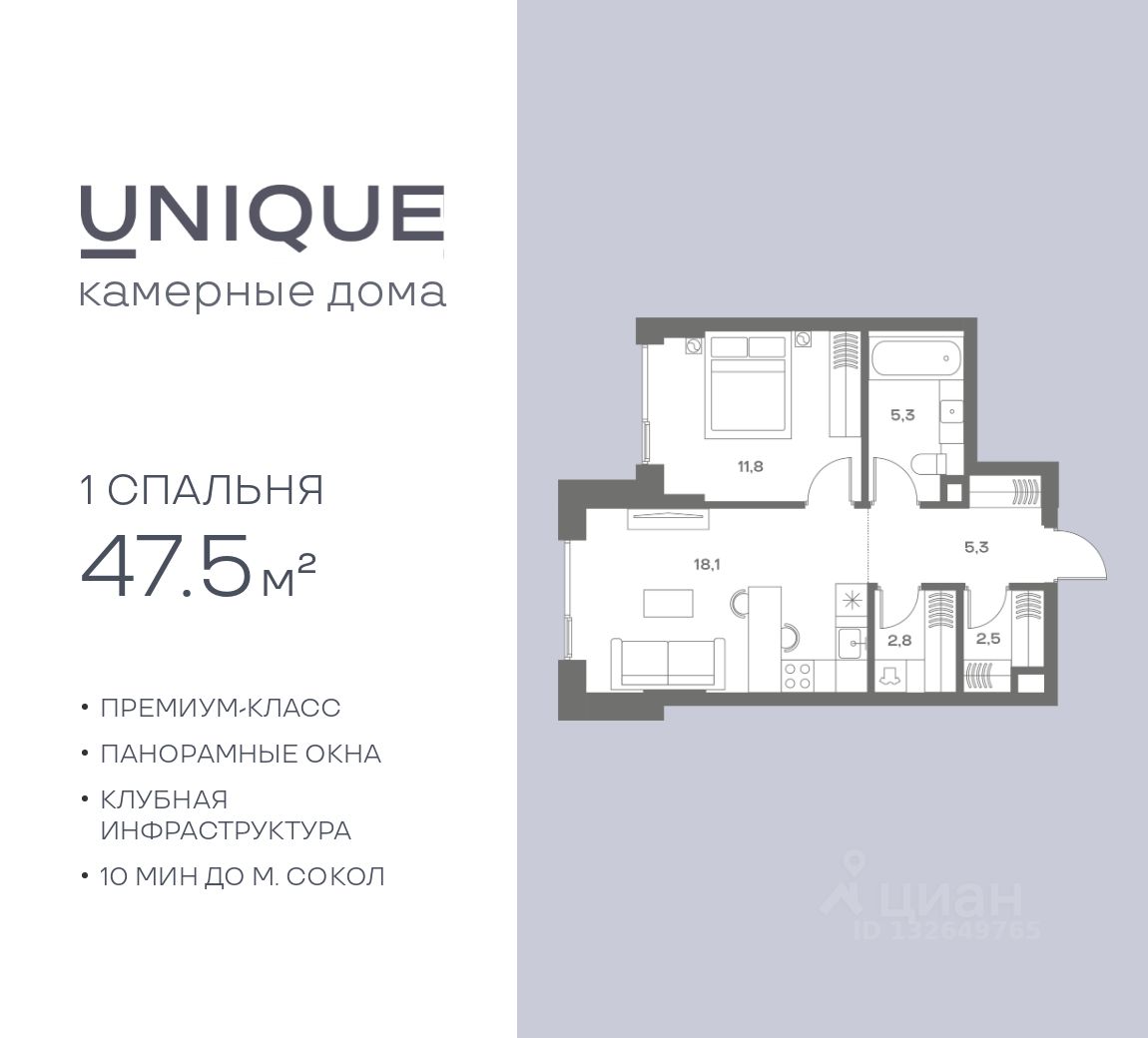 Продается 1-к. квартира номер 805 общей площадью 47.5 кв.м. на 3-м этаже 8 этажного дома, корпус UNIQUE (премиум-класс). С дизайнерской отделкой.