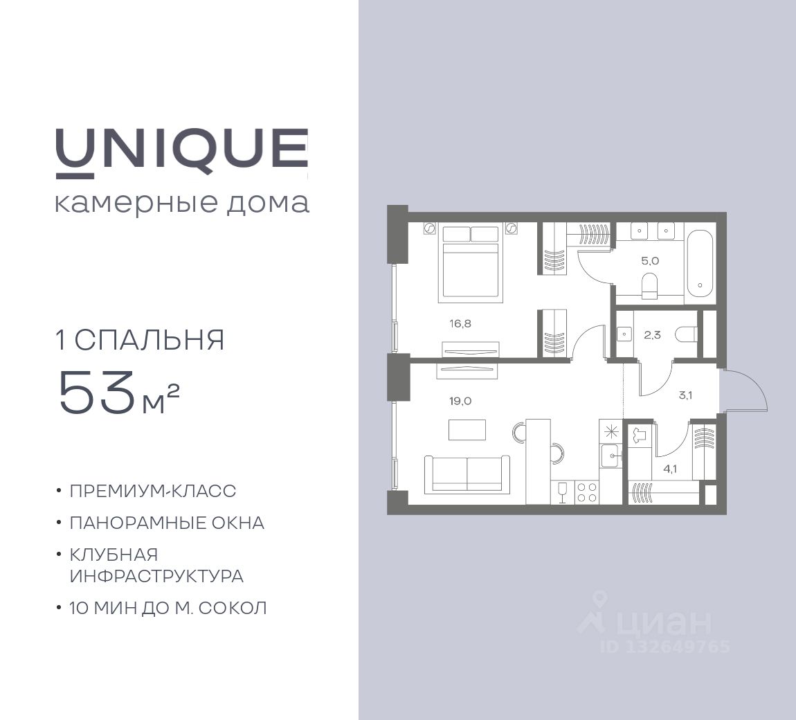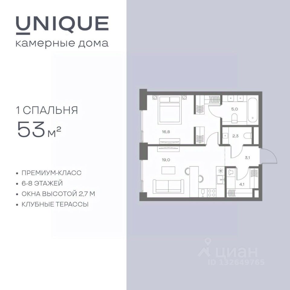Продается 1-к. квартира номер 855 общей площадью 53 кв.м. на 7-м этаже 8 этажного дома, корпус UNIQUE (премиум-класс). Без отделки.