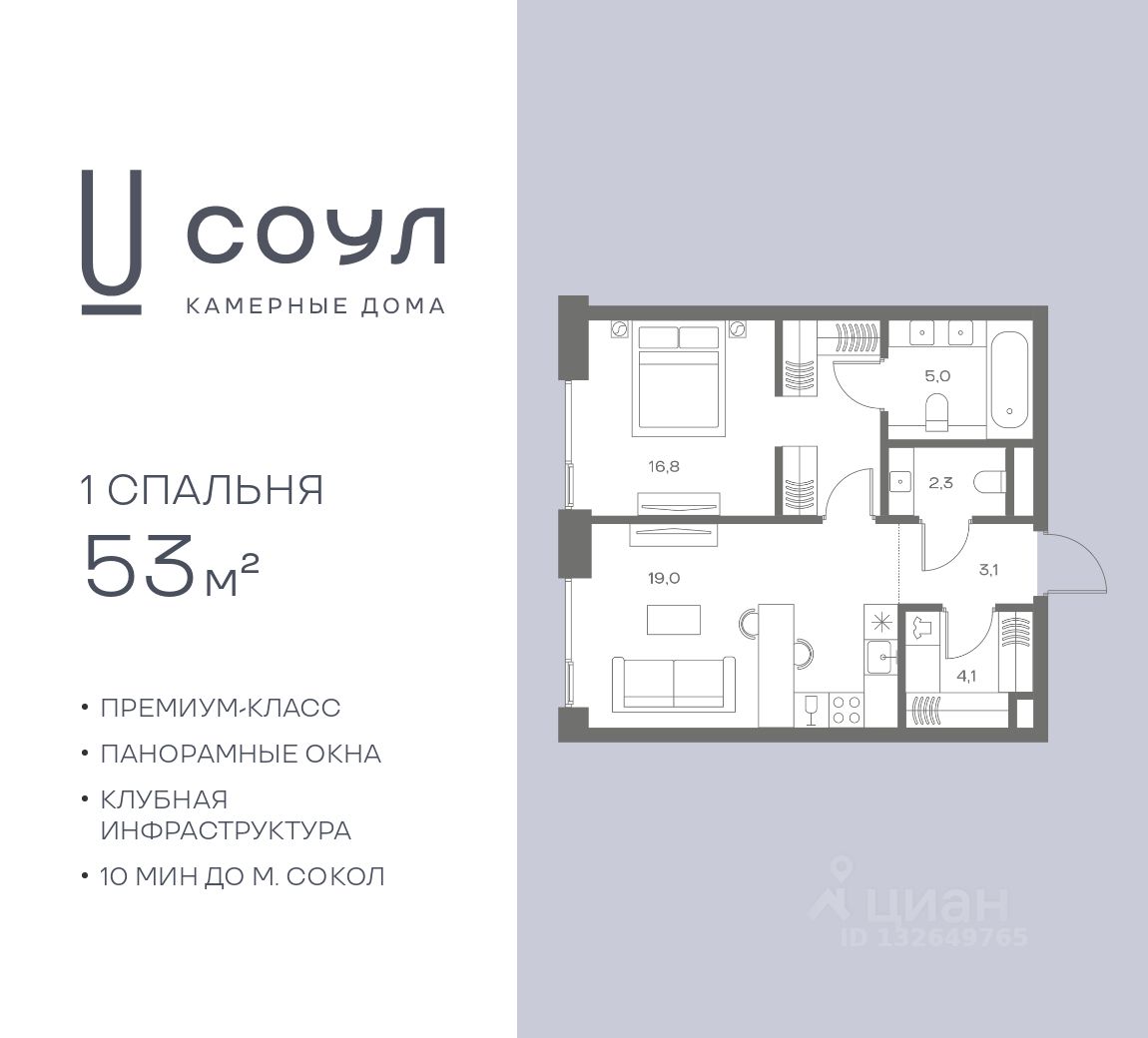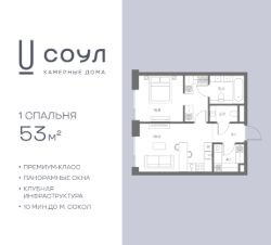 Продается 1-к. квартира номер 855 общей площадью 53 кв.м. на 7-м этаже 8 этажного дома, камерные дома СОУЛ (премиум-класс). Без отделки.