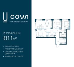 Продается 3-к. квартира номер 822 общей площадью 81.1 кв.м. на 20-м этаже 24 этажного дома, Корпус 9. С отделкой White Box Max.