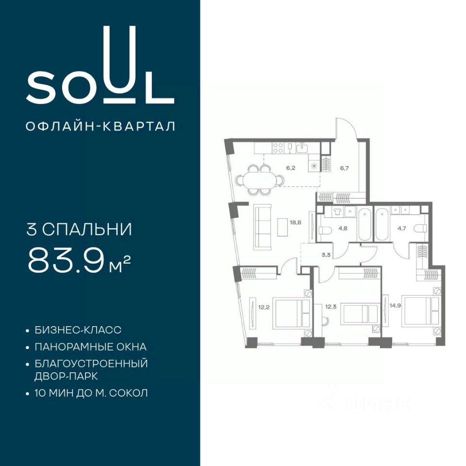 Продается 3-к. квартира номер 818 общей площадью 83.9 кв.м. на 20-м этаже 24 этажного дома, Корпус 9. С отделкой White Box Max.
